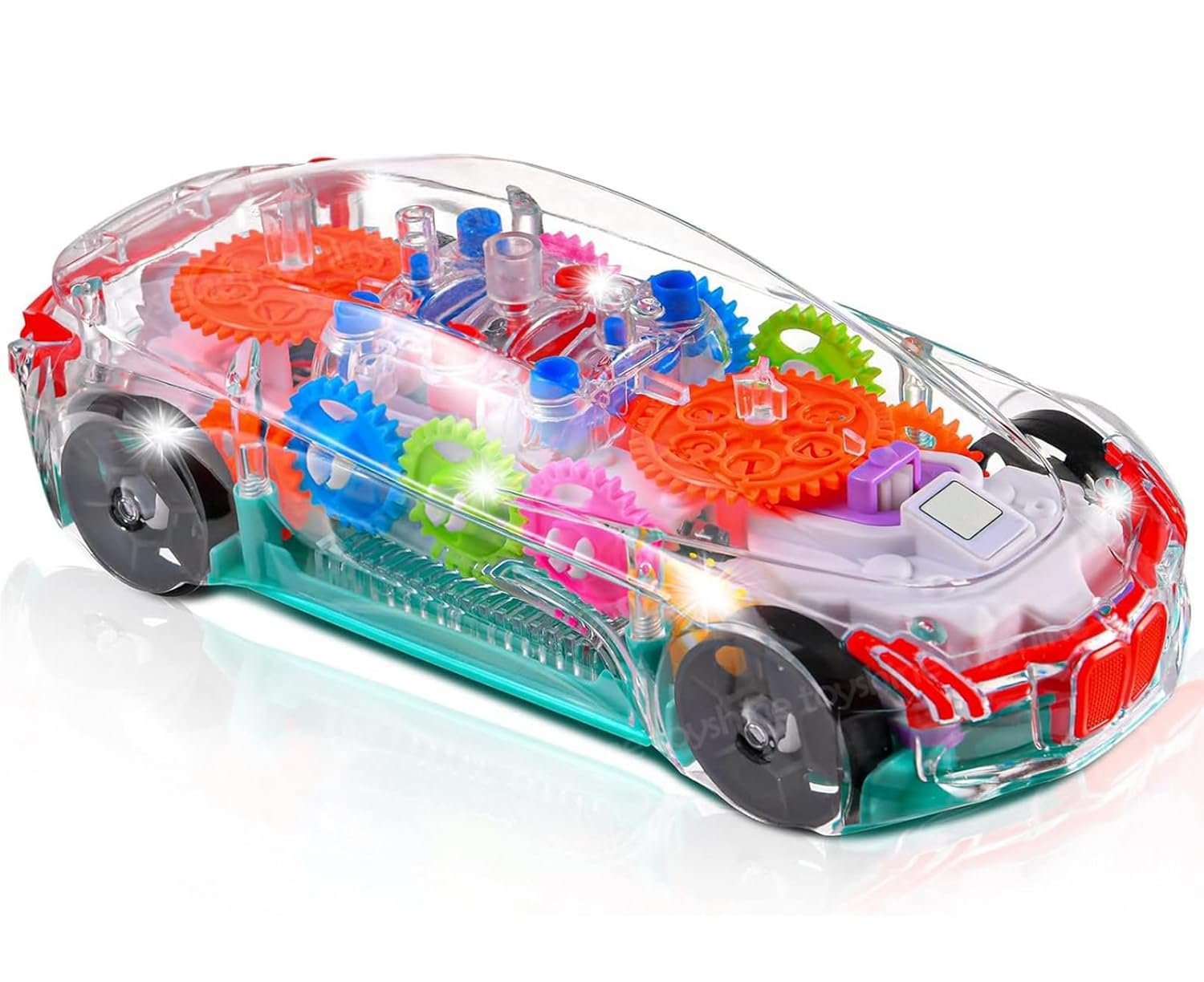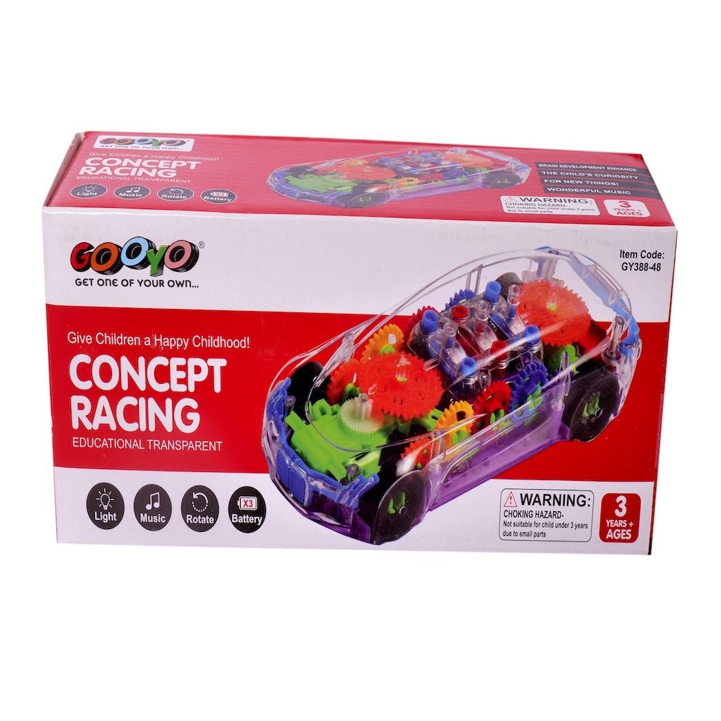 Brand / Model: Often sold under generic names (“Transparent Concept Racing Car”, “3D Transparent Gear Car”) by different manufacturers. One listing: “Babuniya Concept Musical and 3D Lights Kids Transparent Car.”